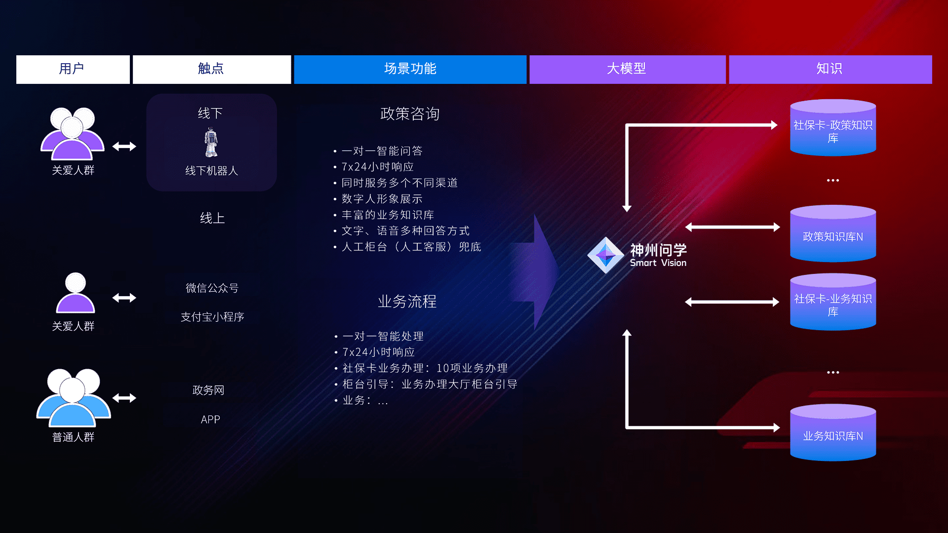 • 线上线下全覆盖:线上提供微信公众号、、、、支付宝小程序、、政务网、、、app多种渠道,,,与线下机器人形成完整服务体系。。。